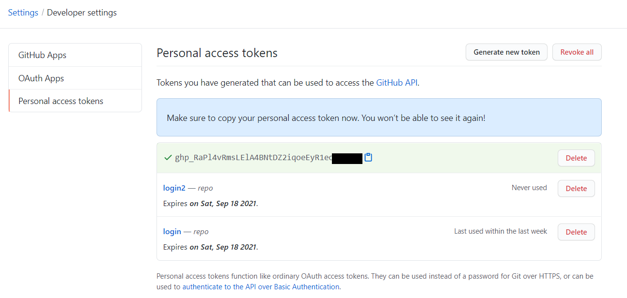 5. Generate token 버튼을 누르시면 토큰 발급이 완료되고 복사하셔서 로그인하시면 됩니다.