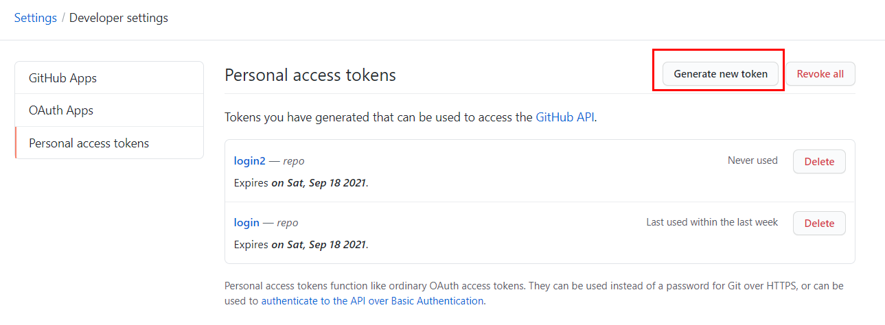 3. Developer settings를 들어가면 Personal access tokens를 클릭하신 후 오른쪽에 있는 Generate new token로 진입합니다.