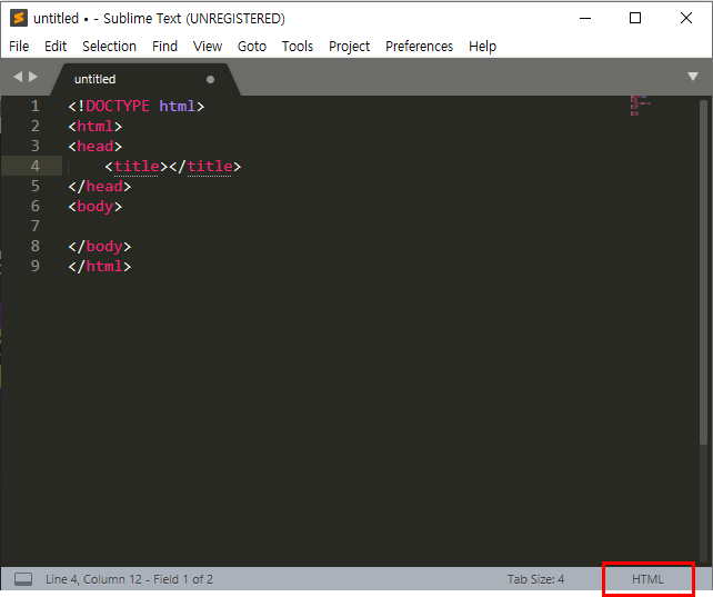 밑에 네모 상자 칸을 눌러 HTML로 변경해준뒤 <html>을 입력하면 자동으로 구조를 입력해줍니다.