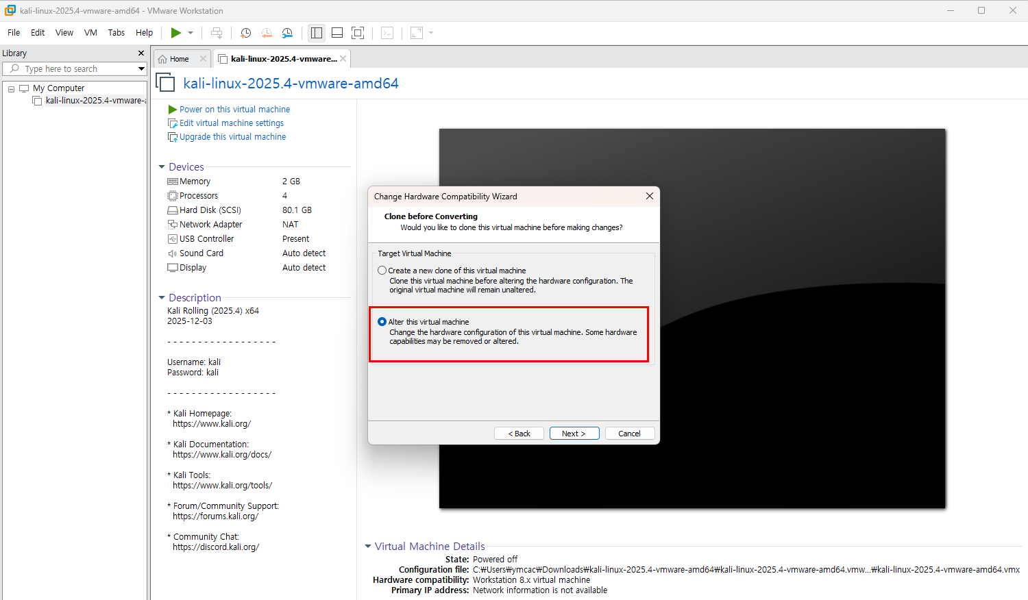 설치한 칼리를 종료한 후 Upgrade this vurtual machine을 클릭합니다.